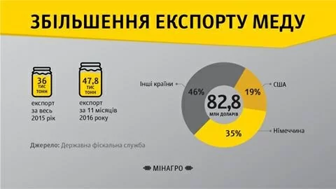 Экспорт меда в 2016 году принес украинским производителям почти 83 млн долларов. В географической структуре экспорта 35% пришлось на ФРГ, 19% – на США, 46% – на другие страны.
